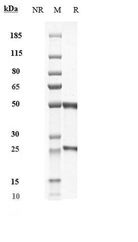 Anti-VEGFR2 / KDR / CD309 Antibody (olinvacimab) on SDS-PAGE under reducing (R) condition. The purity of the protein is greater than 95%.