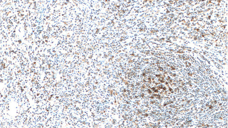 Immunohistochemistry of paraffin-embedded human tonsillitis tissue slide using Catalog No:107459(PD-1/CD279 Antibody) at dilution of 1:200 (under 10x lens). Heat mediated antigen retrieved with Tris-EDTA buffer, pH9.0