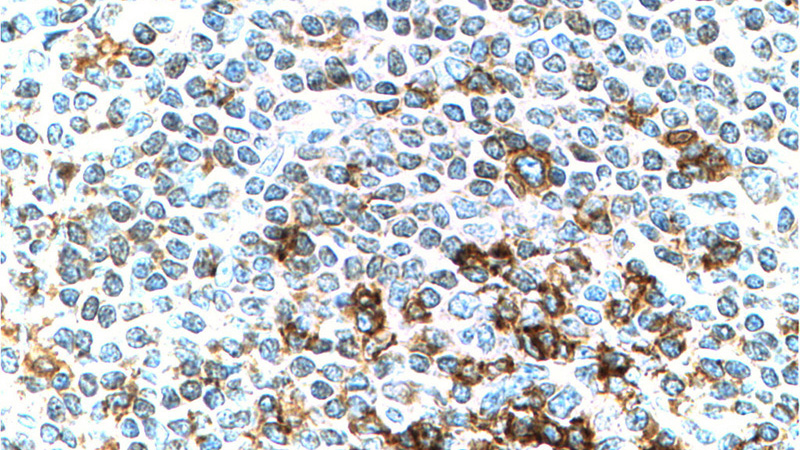 Immunohistochemistry of paraffin-embedded human tonsillitis tissue slide using Catalog No:107459(PD-1/CD279 Antibody) at dilution of 1:200 (under 40x lens). Heat mediated antigen retrieved with Tris-EDTA buffer, pH9.0