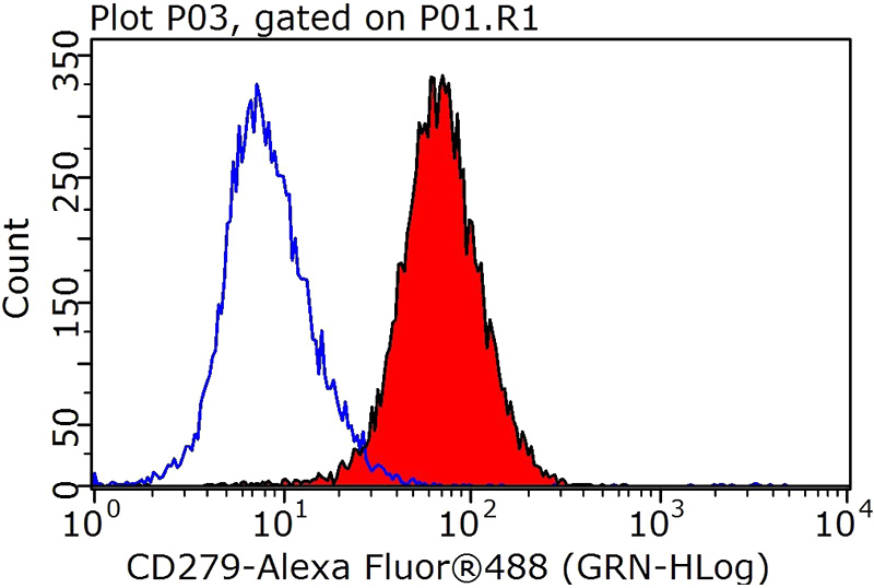 1X10^6 HeLa cells were stained with 0.2ug PD-1/CD279 antibody (Catalog No:113761, red) and control antibody (blue). Fixed with 90% MeOH blocked with 3% BSA (30 min). Alexa Fluor 488-congugated AffiniPure Goat Anti-Rabbit IgG(H+L) with dilution 1:1000.