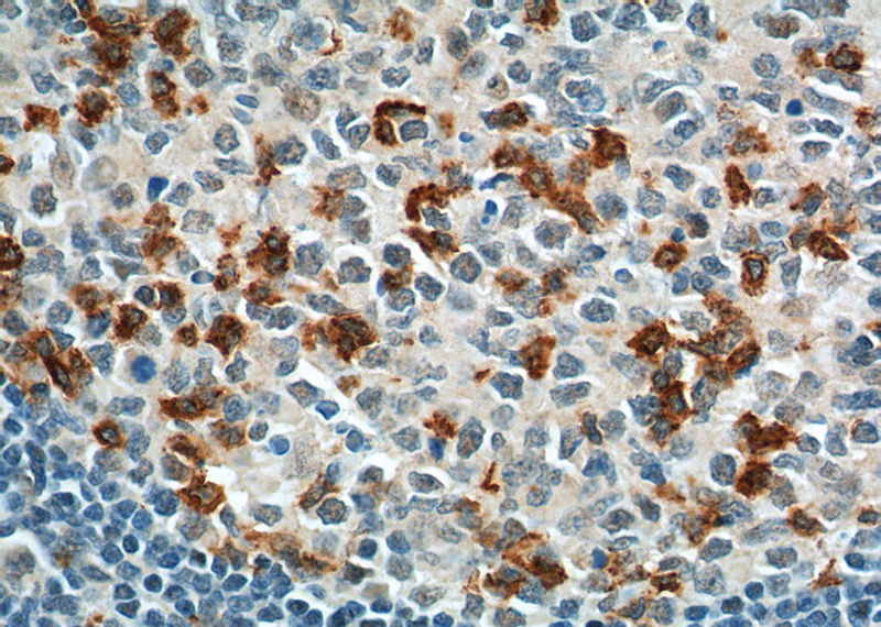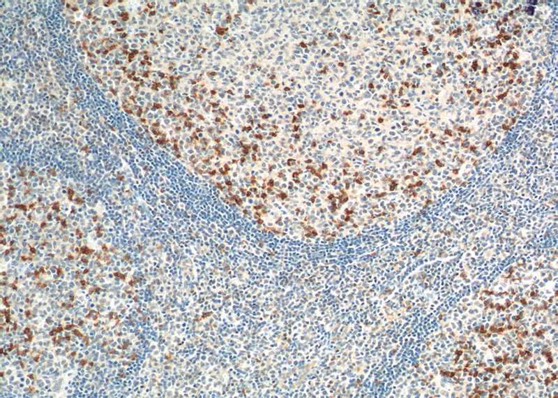Immunohistochemistry of paraffin-embedded human tonsillitis tissue slide using Catalog No:113761(PD-1/CD279 Antibody) at dilution of 1:200 (under 40x lens). heat mediated antigen retrieved with Tris-EDTA buffer(pH9).