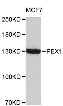 Western blot analysis of extracts of MCF-7 cells, using PEX1 antibody .Secondary antibody: HRP Goat Anti-Rabbit IgG (H+L) at 1:10000 dilution.Lysates/proteins: 25ug per lane.Blocking buffer: 3% nonfat dry milk in TBST.