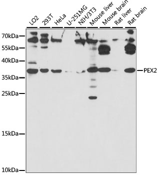 Western blot analysis of extracts of various cell lines, using PEX2 antibody at 1:1000 dilution.Secondary antibody: HRP Goat Anti-Rabbit IgG (H+L) at 1:10000 dilution.Lysates/proteins: 25ug per lane.Blocking buffer: 3% nonfat dry milk in TBST.Detection: ECL Basic Kit .Exposure time: 20s.