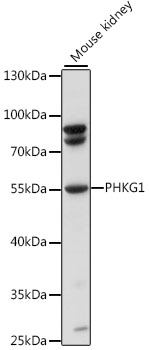Western blot analysis of extracts of mouse kidney, using PHKG1 antibody at 1:1000 dilution.Secondary antibody: HRP Goat Anti-Rabbit IgG (H+L) at 1:10000 dilution.Lysates/proteins: 25ug per lane.Blocking buffer: 3% nonfat dry milk in TBST.Detection: ECL Basic Kit .Exposure time: 5s.