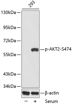 Western blot analysis of extracts from 293 cells using Phospho-AKT2-S474 antibody .Secondary antibody: HRP Goat Anti-Rabbit IgG (H+L) at 1:10000 dilution.Lysates/proteins: 25ug per lane.Blocking buffer: 3% BSA.