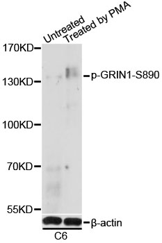 Western blot analysis of extracts of C6 cells, using Phospho-GRIN1-S890 antibody at 1:1000 dilution. C6 cells were treated by PMA/TPA (200nM) for 30 minutes after serum-starvation overnight.Secondary antibody: HRP Goat Anti-Rabbit IgG (H+L) at 1:10000 dilution.Lysates/proteins: 25ug per lane.Blocking buffer: 3% BSA.Detection: ECL Basic Kit .Exposure time: 90s.