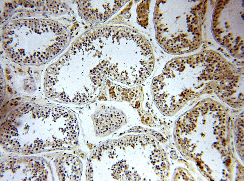 Immunohistochemical of paraffin-embedded human testis using Catalog No:113894(PIGM antibody) at dilution of 1:100 (under 10x lens)