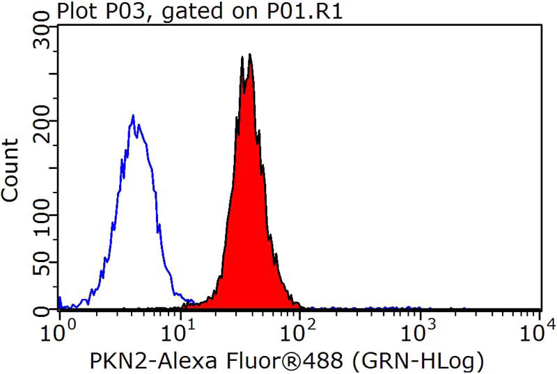 1X10^6 HepG2 cells were stained with 0.2ug PKN2 antibody (Catalog No:113919, red) and control antibody (blue). Fixed with 90% MeOH blocked with 3% BSA (30 min). Alexa Fluor 488-congugated AffiniPure Goat Anti-Rabbit IgG(H+L) with dilution 1:1500.