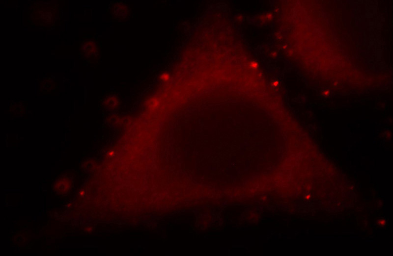 Immunofluorescent analysis of HepG2 cells, using PKN2 antibody Catalog No:113919 at 1:25 dilution and Rhodamine-labeled goat anti-rabbit IgG (red).