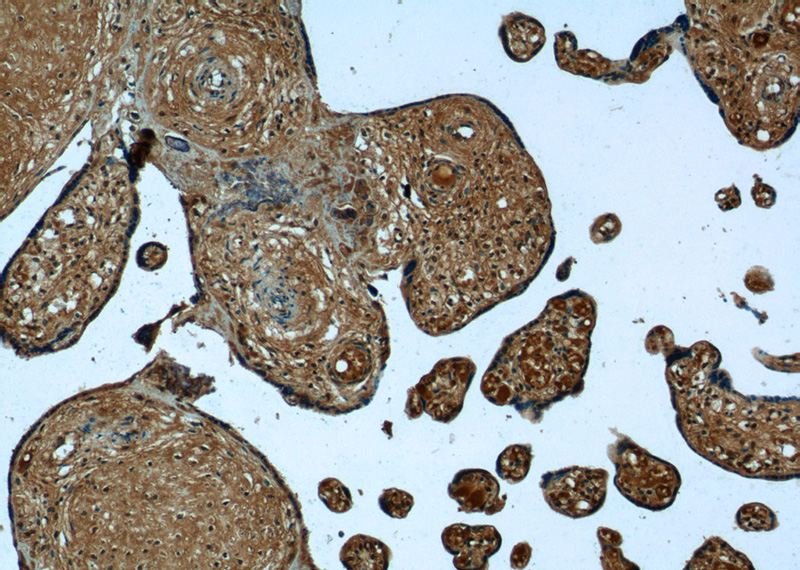 Immunohistochemistry of paraffin-embedded human placenta tissue slide using Catalog No:114087(PPBP Antibody) at dilution of 1:50 (under 10x lens)