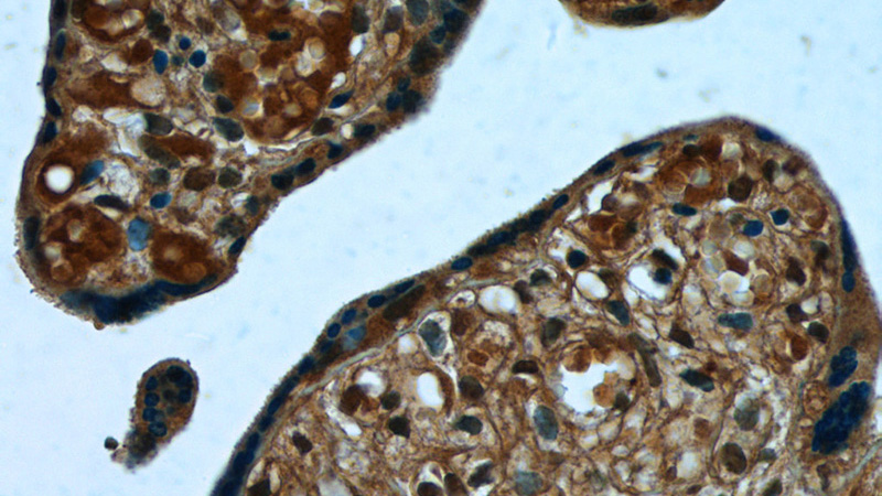 Immunohistochemistry of paraffin-embedded human placenta tissue slide using Catalog No:114087(PPBP Antibody) at dilution of 1:50 (under 40x lens)