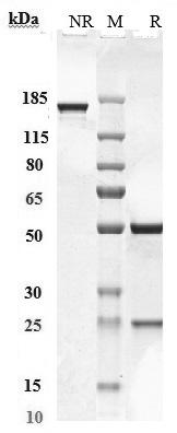 Anti-PDCD1 / PD-1 / CD279 Antibody (prolgolimab) on SDS-PAGE under reducing (R) condition. The purity of the protein is greater than 90%.