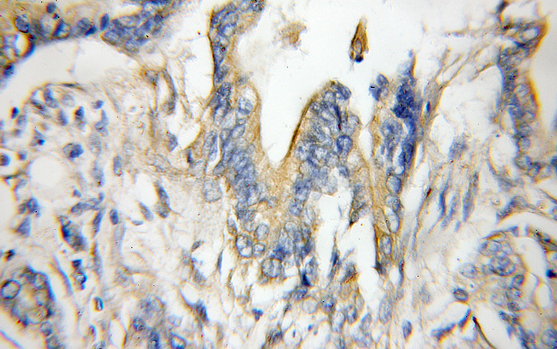 Immunohistochemical of paraffin-embedded human pancreas cancer using Catalog No:114416(RAB1A antibody) at dilution of 1:50 (under 10x lens)