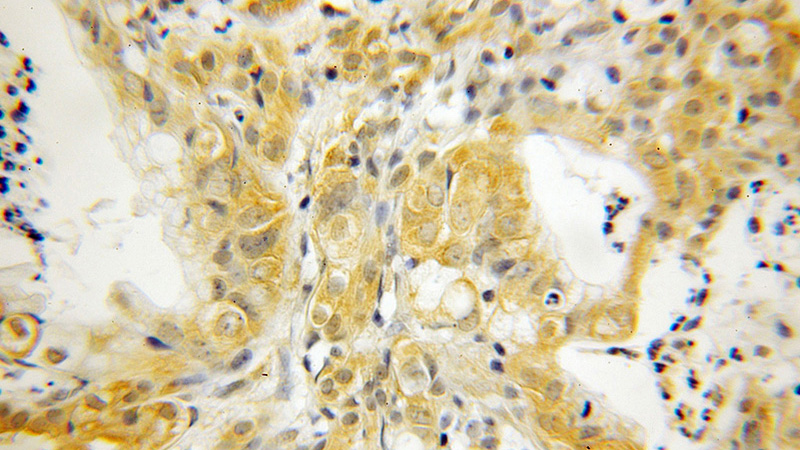Immunohistochemical of paraffin-embedded human pancreas cancer using Catalog No:114448(RABIN8 antibody) at dilution of 1:50 (under 10x lens)