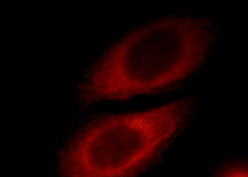 Immunofluorescent analysis of HepG2 cells, using RAB3IP antibody Catalog No:114448 at 1:25 dilution and Rhodamine-labeled goat anti-rabbit IgG (red).