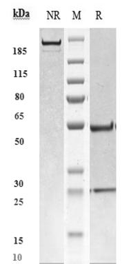 Anti-Fibronectin Antibody (radretumab) on SDS-PAGE under reducing (R) condition. The purity of the protein is greater than 95%.
