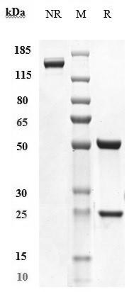 Anti-LAG3 / CD223 Antibody (relatlimab) on SDS-PAGE under reducing (R) condition. The purity of the protein is greater than 95%.