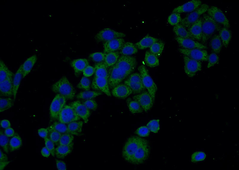 Immunofluorescent analysis of HeLa cells using Catalog No:114657(RHOA Antibody) at dilution of 1:25 and Alexa Fluor 488-congugated AffiniPure Goat Anti-Rabbit IgG(H+L)