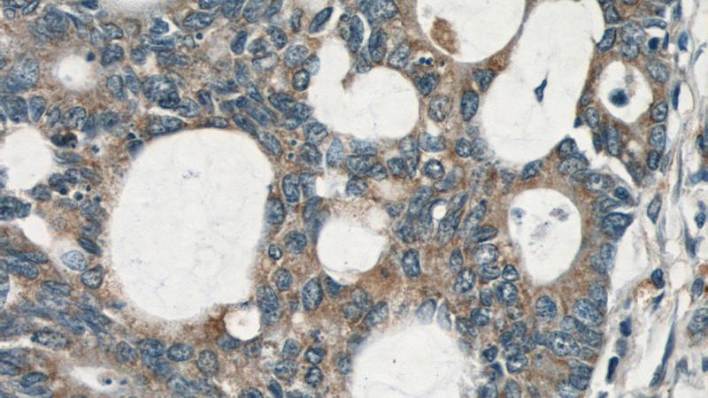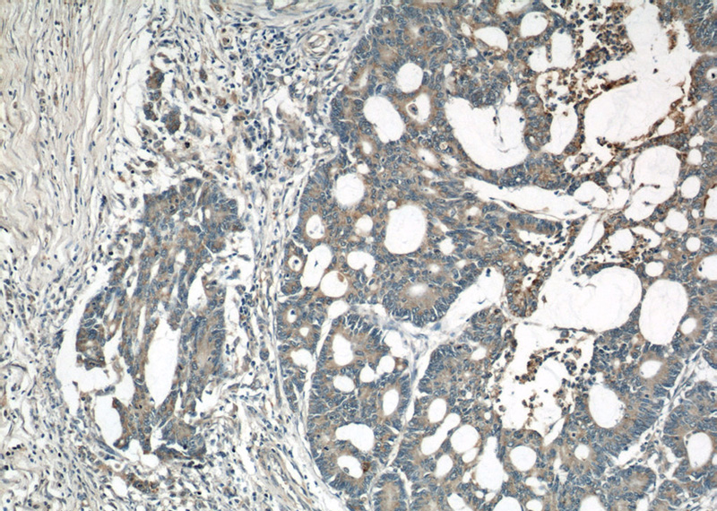Immunohistochemical of paraffin-embedded human colon cancer using Catalog No:114657(RHOA antibody) at dilution of 1:50 (under 40x lens)