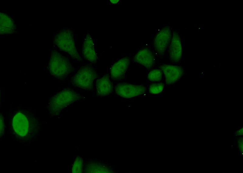 Immunofluorescent analysis of HeLa cells using Catalog No:114764(RNF8 Antibody) at dilution of 1:50 and Alexa Fluor 488-congugated AffiniPure Goat Anti-Rabbit IgG(H+L)