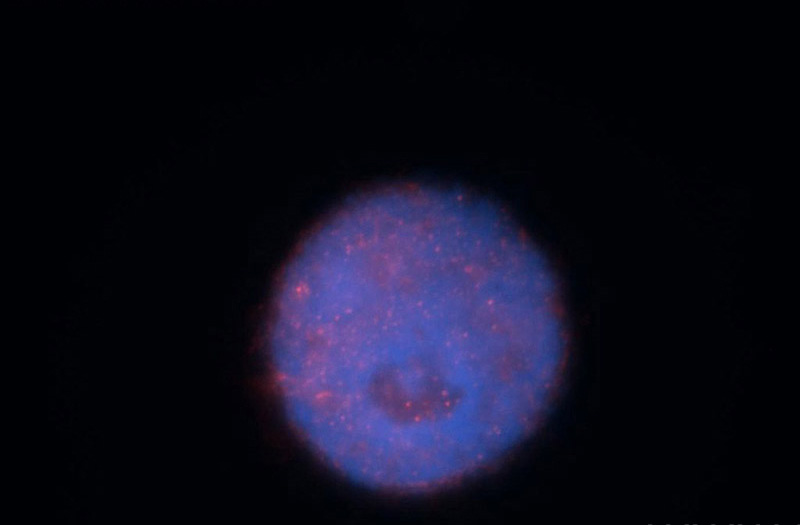 Immunofluorescent analysis of Hela cells, using RNMT antibody Catalog No:114768 at 1:50 dilution and Rhodamine-labeled goat anti-rabbit IgG (red). Blue pseudocolor = DAPI (fluorescent DNA dye).