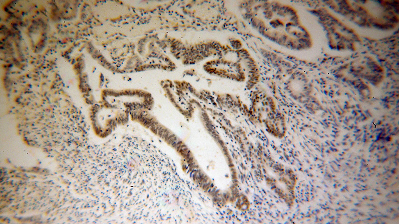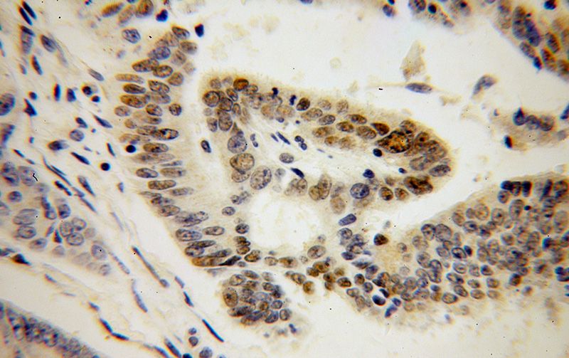 Immunohistochemical of paraffin-embedded human colon cancer using Catalog No:114768(RNMT antibody) at dilution of 1:50 (under 10x lens)
