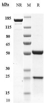 Anti-DLL3 Antibody (rovalpituzumab) on SDS-PAGE under reducing (R) condition. The purity of the protein is greater than 95%.
