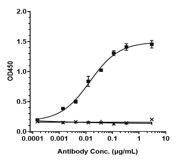 Human DLL3 HEK293 cells were stained with Anti-DLL3 Antibody (rovalpituzumab) and negative control protein respectively, washed and then followed by PE and analyzed with FACS, EC50=0.01586 ug/mL.