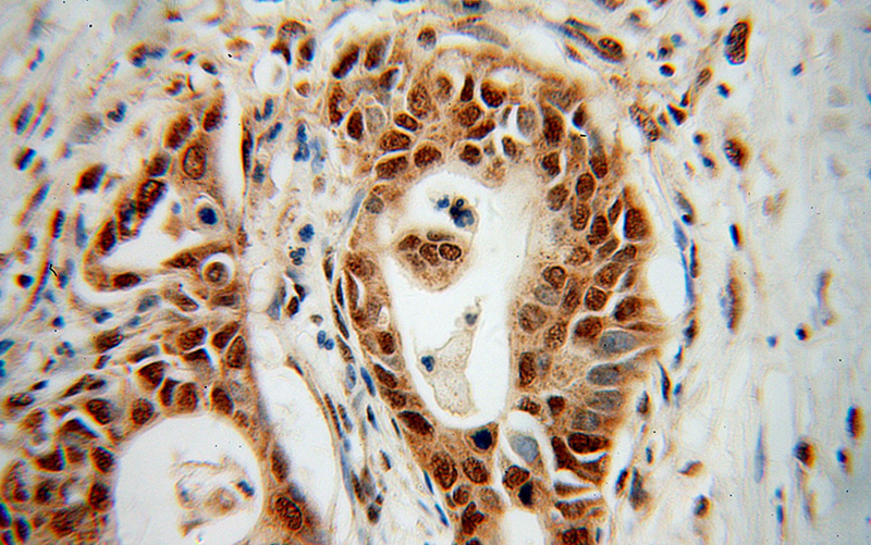Immunohistochemical of paraffin-embedded human pancreas cancer using Catalog No:114817(RPL17 antibody) at dilution of 1:100 (under 40x lens)