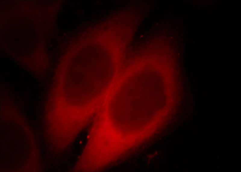 Immunofluorescent analysis of Hela cells, using RPS3 antibody Catalog No: at 1:25 dilution and Rhodamine-labeled goat anti-mouse IgG (red).