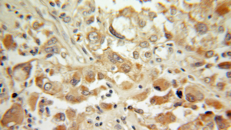 Immunohistochemical of paraffin-embedded human ovary tumor using Catalog No:114975(SAT1 antibody) at dilution of 1:100 (under 10x lens)