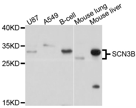 Western blot analysis of extracts of various cell lines, using SCN3B antibody at 1:1000 dilution.Secondary antibody: HRP Goat Anti-Rabbit IgG (H+L) at 1:10000 dilution.Lysates/proteins: 25ug per lane.Blocking buffer: 3% nonfat dry milk in TBST.Detection: ECL Basic Kit .Exposure time: 5s.