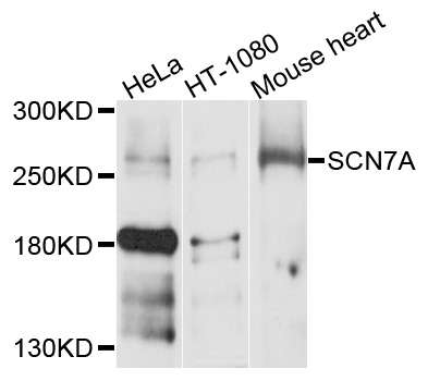 Western blot analysis of extracts of various cell lines, using SCN7A antibody at 1:1000 dilution.Secondary antibody: HRP Goat Anti-Rabbit IgG (H+L) at 1:10000 dilution.Lysates/proteins: 25ug per lane.Blocking buffer: 3% nonfat dry milk in TBST.Detection: ECL Basic Kit .Exposure time: 10s.