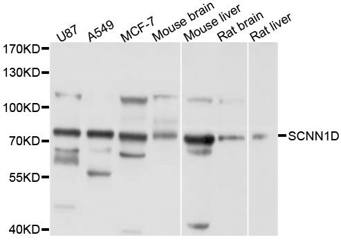 Western blot analysis of extracts of various cell lines, using SCNN1D antibody at 1:1000 dilution.Secondary antibody: HRP Goat Anti-Rabbit IgG (H+L) at 1:10000 dilution.Lysates/proteins: 25ug per lane.Blocking buffer: 3% nonfat dry milk in TBST.Detection: ECL Basic Kit .Exposure time: 1s.