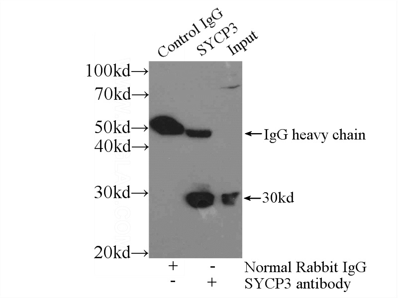 SCP3 Rabbit Polyclonal antibody. Positive IF detected in HepG2 cells. Positive IP detected in mouse testis tissue. Positive WB detected in mouse testis tissue, HepG2 cells, rat testis tissue. Observed molecular weight by Western-blot: 30 kDa