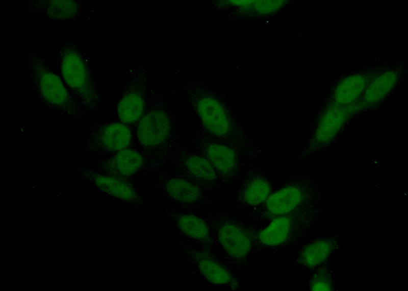 Immunofluorescent analysis of (10% Formaldehyde) fixed HepG2 cells using Catalog No:115017(SYCP3 Antibody) at dilution of 1:50 and Alexa Fluor 488-congugated AffiniPure Goat Anti-Rabbit IgG(H+L)