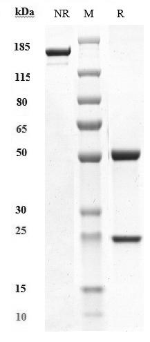 Anti-CTLA-8 / IL-17a Antibody (secukinumab) on SDS-PAGE under reducing (R) condition. The purity of the protein is greater than 95%.