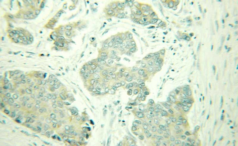 Immunohistochemical of paraffin-embedded human breast cancer using Catalog No:115099(DHCR24 antibody) at dilution of 1:100 (under 25x lens)