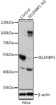 Western blot analysis of extracts from normal (control) and SELENBP1 knockout HeLa cells, using SELENBP1 antibody at 1:1000 dilution.Secondary antibody: HRP Goat Anti-Rabbit IgG (H+L) at 1:10000 dilution.Lysates/proteins: 25ug per lane.Blocking buffer: 3% nonfat dry milk in TBST.Detection: ECL Basic Kit .Exposure time: 5s.