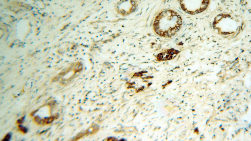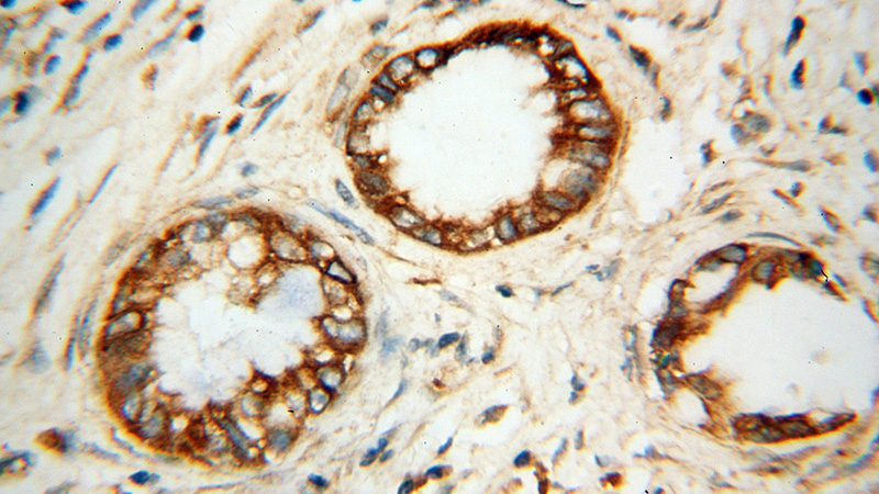 Immunohistochemical of paraffin-embedded human pancreas cancer using Catalog No:115127(ATP2A3 antibody) at dilution of 1:100 (under 10x lens)