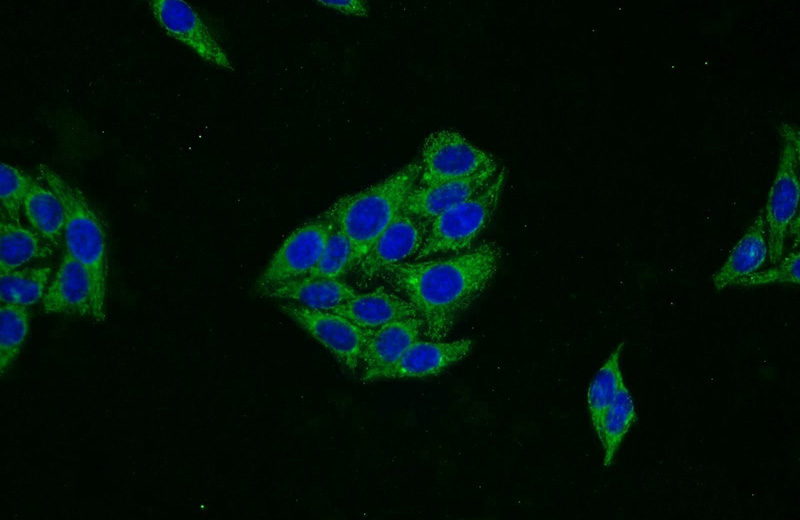 Immunofluorescent analysis of HepG2 cells using Catalog No:115209(SERPING1 Antibody) at dilution of 1:25 and Alexa Fluor 488-congugated AffiniPure Goat Anti-Rabbit IgG(H+L)