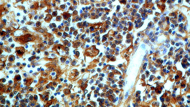 Immunohistochemical of paraffin-embedded human spleen using Catalog No:115212(APCS antibody) at dilution of 1:50 (under 40x lens)