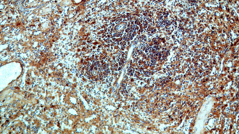 Immunohistochemical of paraffin-embedded human spleen using Catalog No:115212(APCS antibody) at dilution of 1:50 (under 10x lens)