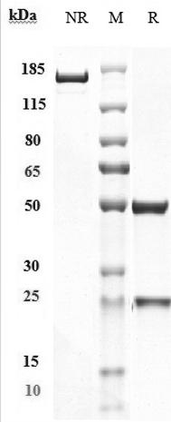 Anti-PDCD1 / PD-1 / CD279 Antibody (spartalizumab) on SDS-PAGE under reducing (R) condition. The purity of the protein is greater than 95%.