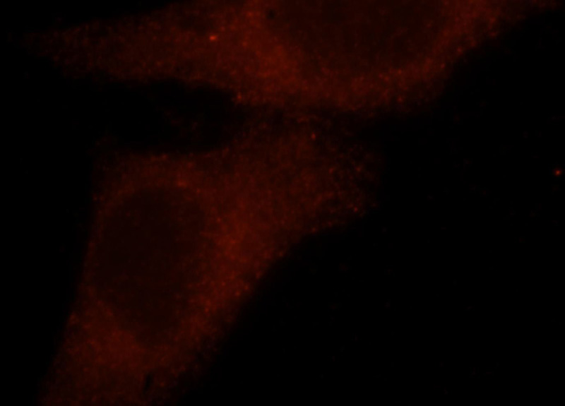Immunofluorescent analysis of HepG2 cells, using TRIOBP antibody Catalog No:115852 at 1:25 dilution and Rhodamine-labeled goat anti-rabbit IgG (red).