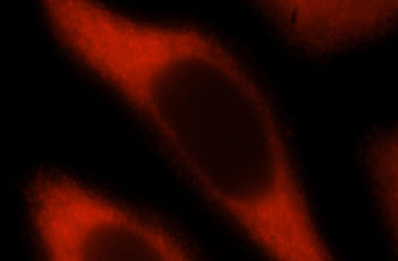 Immunofluorescent analysis of Hela cells, using TBCB antibody Catalog No:115870 at 1:25 dilution and Rhodamine-labeled goat anti-rabbit IgG (red).