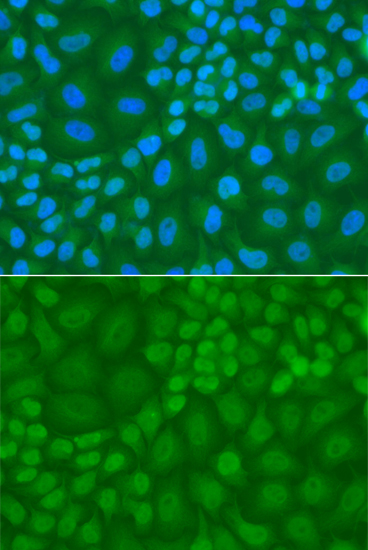 Immunofluorescence analysis of A549 cells using TDG antibody . Blue: DAPI for nuclear staining.