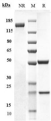 Anti-CEACAM6 / CD66c Antibody (tinurilimab) on SDS-PAGE under reducing (R) condition. The purity of the protein is greater than 95%.