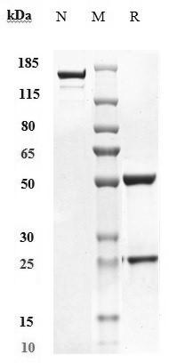 Anti-TF / Factor III / Tissue Factor / CD142 Antibody (tisotumab) on SDS-PAGE under reducing (R) condition. The purity of the protein is greater than 95%.