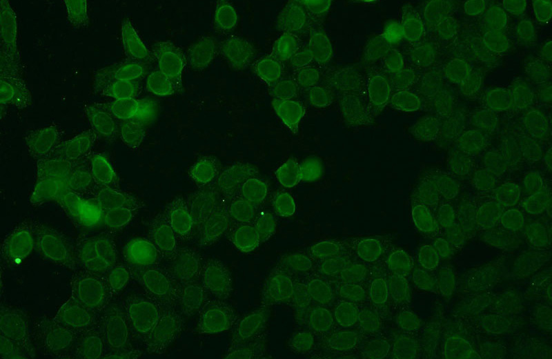 Immunofluorescent analysis of HeLa cells using Catalog No:116094(TMEM120A Antibody) at dilution of 1:25 and Alexa Fluor 488-congugated AffiniPure Goat Anti-Rabbit IgG(H+L)